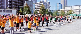 丸子地区の9つの町会(新丸子町内会、新丸子東町会、新丸子東二・三丁目親和会、丸子通一丁目町会、丸子通2丁目町会、上丸子八幡町町内会、上丸子天神町町会、上丸子山王町一丁目町会、上丸子山王町二丁目町会)が集まる丸子地区連合町会の大運動会が10月13日、上丸子小学校で行われた。子どもからシニアまで延べ500人が参加した。