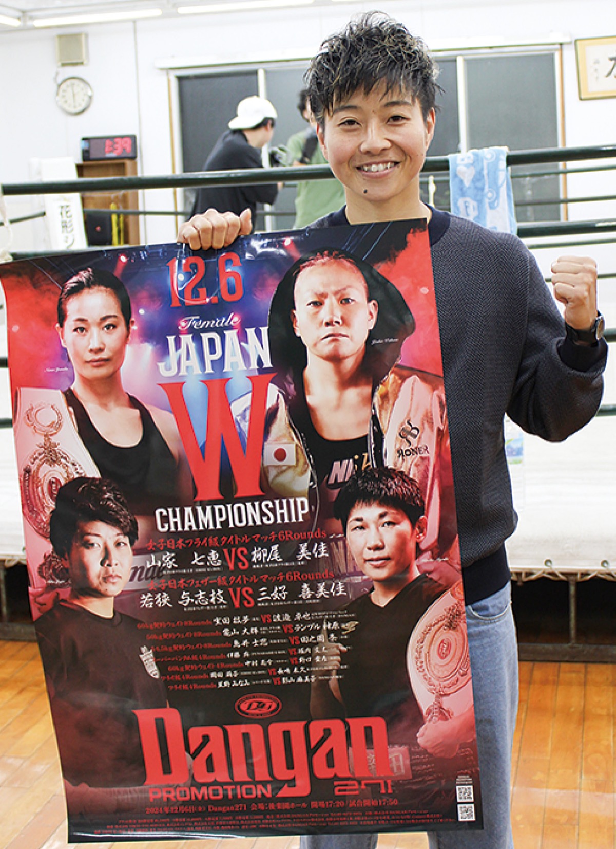 プロになって5年。目標としてきたタイトルに初挑戦する。対戦相手は、日本女子フライ級王者の山家七恵さんだ。着実にポイントを取るサウスポーの王者に対し、右ストレートを武器に攻撃的なスタイルが持ち味の柳尾さん。「自分の実力でどこまで通用するか、今からわくわくしている。積極的に仕掛けていきたい」と意気込む。柳尾さんは試合に向け「気持ちを強く持って戦う。応援に来てくれたら嬉しい」と呼び掛ける。