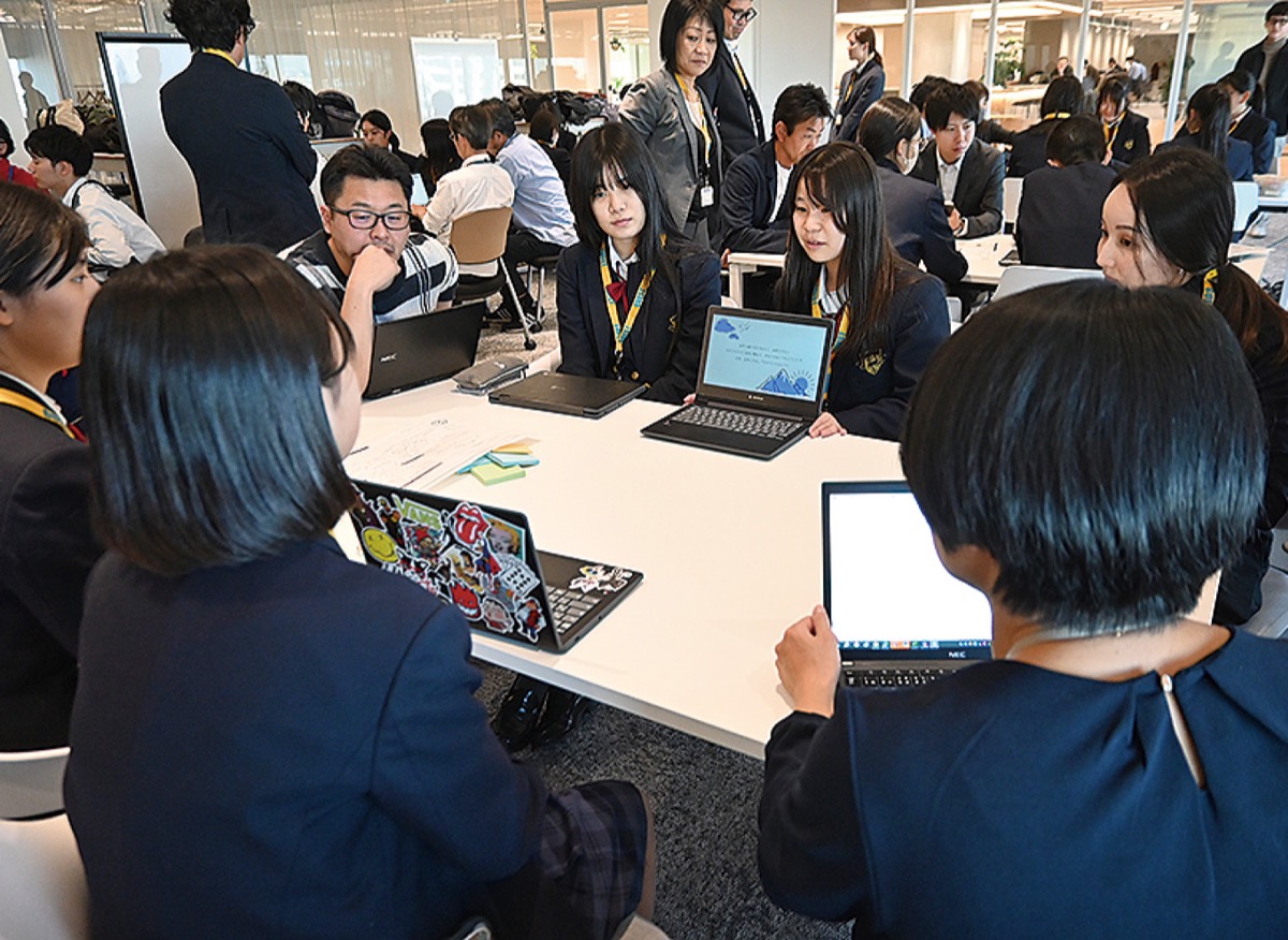 今回、川崎市市制100周年に合わせて、地元の市立橘高校の生徒が参加。10グループに分かれて「できたらすごい」をテーマに、自らが考えた「トランスジェンダーへの正しい理解」「川崎の自然を守る」などの実現に向けて、どのようにIT技術を活用するかを社員からアドバイスを受けた。