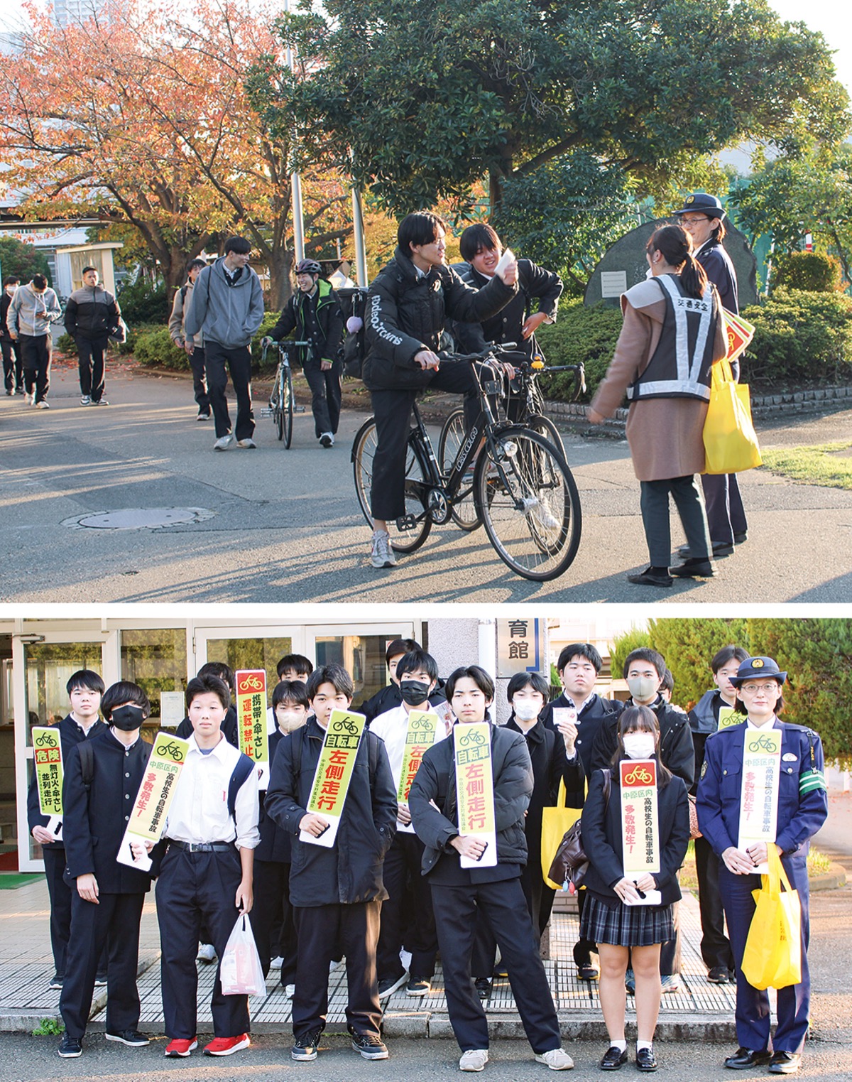 11月1日に改正された道路交通法により、スマホを使った自転車の「ながら運転」などに対する罰則が強化されたことに合わせ、中原警察署や中原区、川崎工科高等学校(上平間)の生徒会と交通安全委員の生徒らが11月22日、自転車の交通安全の啓発活動を行った。