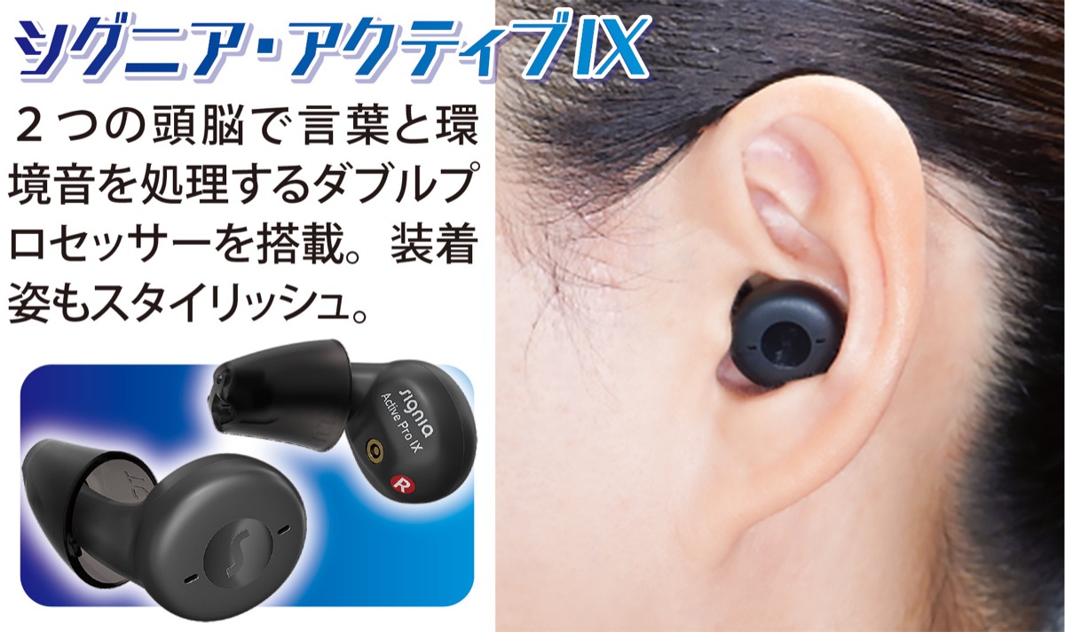 同店が注目する新機種は、シグニア補聴器から登場した「シグニア・アクティブⅨ」。今までの補聴器のイメージを覆すスタイリッシュなデザインで、さまざまなシーンに自動で適応するセンサーを搭載。電池不要の充電タイプで持ち運びしながら充電できるケース付きなのもポイントだ。