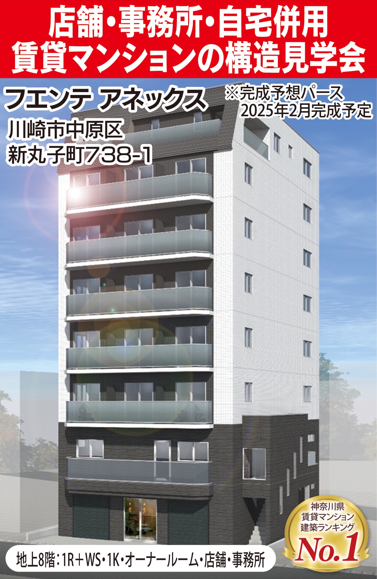 神奈川・東京エリアで721棟9955戸の建築実績を誇る「朝日建設」(本社・相模原市)は、12月14日(土)・15日(日)の午前10時から午後4時まで、新丸子町に建設中の店舗・事務所・自宅併用賃貸マンション「フエンテ アネックス」の構造見学会を開催する。