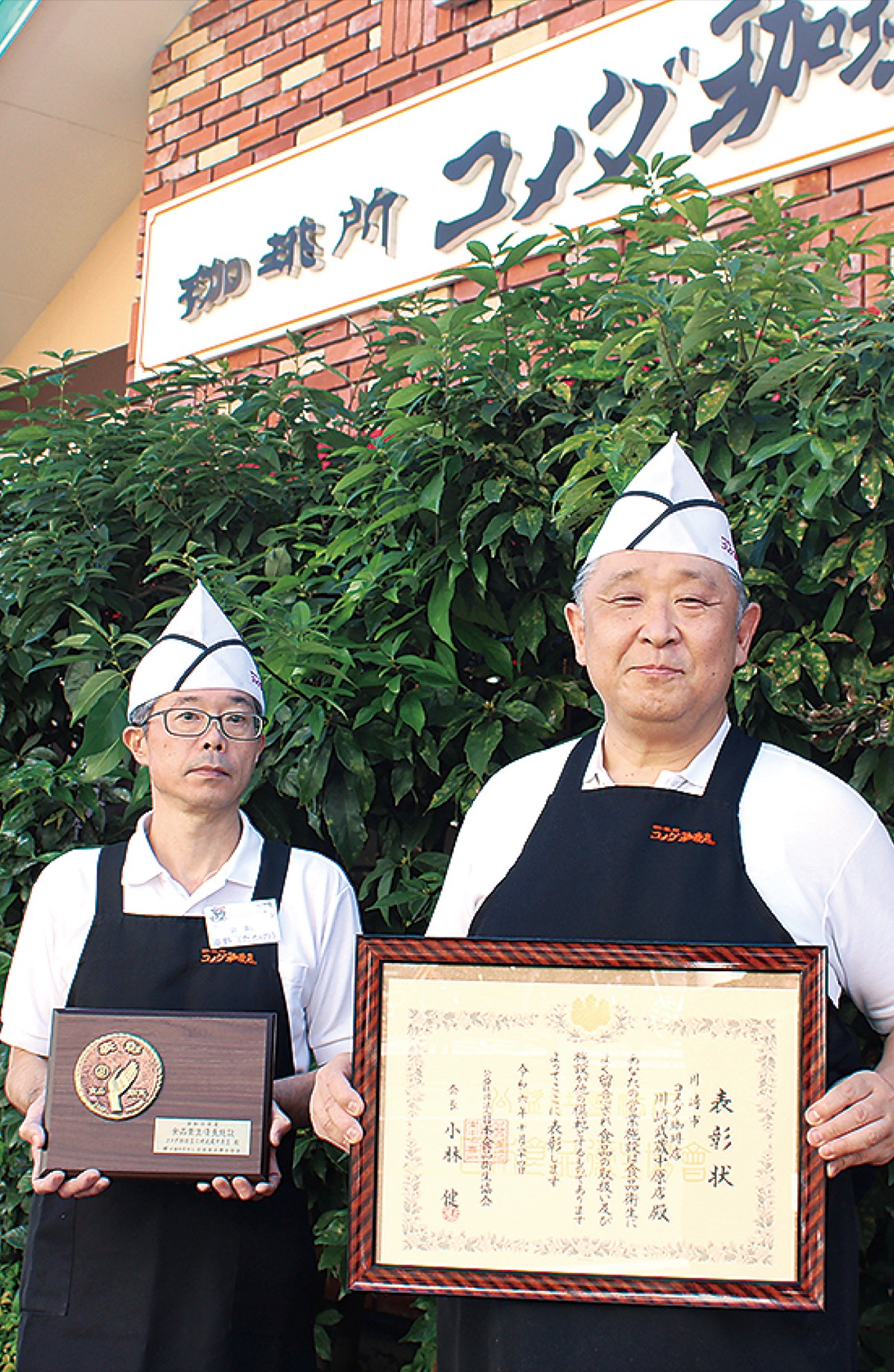 上小田中のコメダ珈琲川崎武蔵中原店を経営する(株)朝岡商店(朝山浩代表)がこのほど、(公社)日本食品衛生協会から食品衛生優良施設として会長表彰を受賞した。