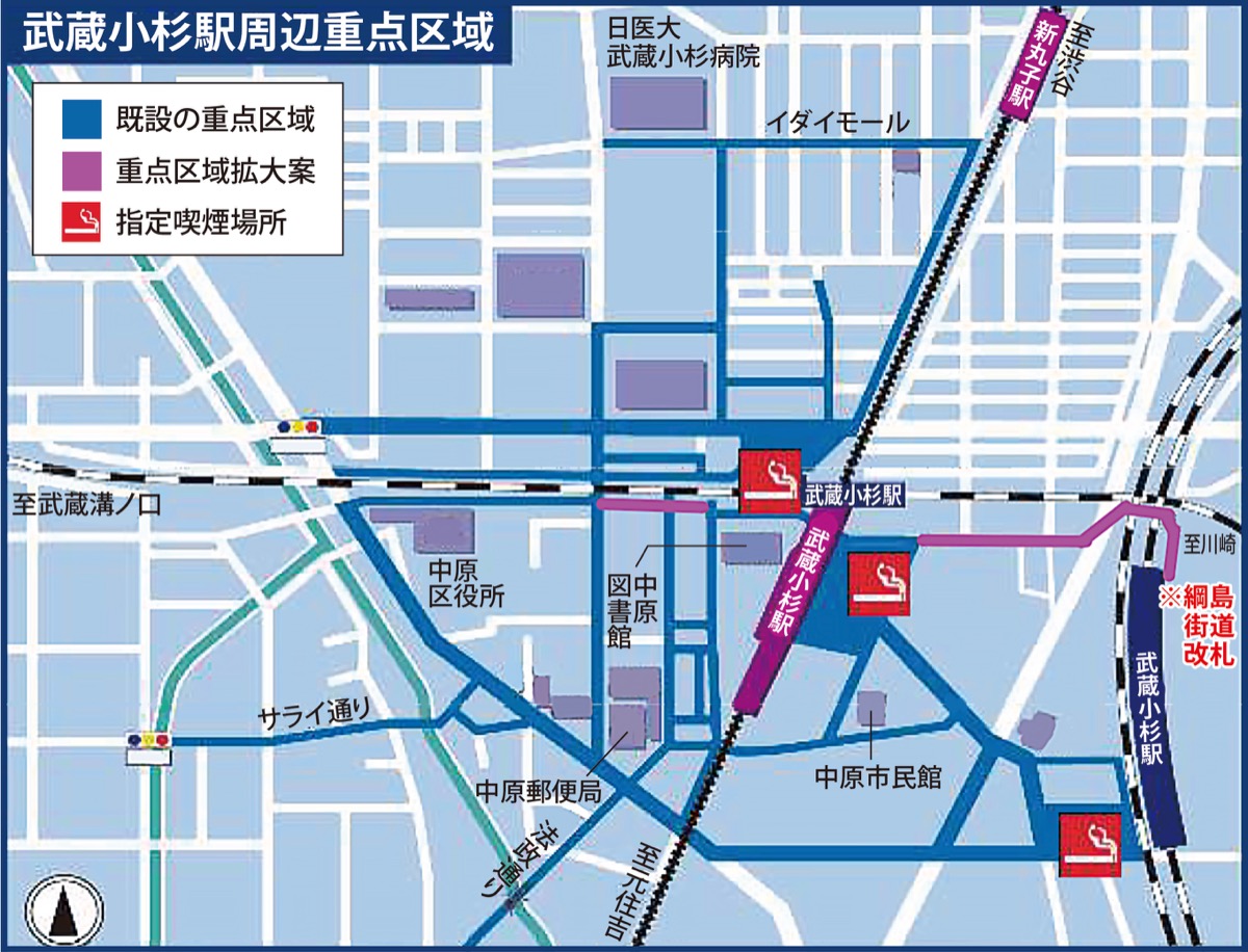 市は今回、地域の環境美化の促進を目的とした「川崎市飲料容器等の散乱(ポイ捨て)防止に関する条例」と、市民等の身体の安全確保を目的とした「川崎市路上喫煙の防止に関する条例」で以前から重点区域に指定していた武蔵小杉駅周辺のエリアを変更・拡大。乗り換えなどで通行量の多い東急武蔵小杉駅からJR横須賀線武蔵小杉駅の綱島街道改札までと、通勤・通学などで通行者の多い武蔵小杉駅から中原区役所までの一部道路が加わった=地図参照。