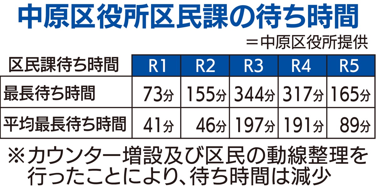 別表のように令和3年の最長待ち時間は344分、平均最長待ち時間は197分だったのが、令和5年には最長待ち時間が165分に、平均最長待ち時間は89分と、それぞれ短縮することができています。これは下表の※印のようにカウンターの増設等による効果と分析しております。また中原区では、窓口混雑情報サイト「中原区なう!」を活用して来庁者の平準化や、お呼び出しメールで混雑緩和に努めています。しかし、中原区においては、令和10年には日本医科大学武蔵小杉キャンパス跡地に約1400戸のタワーマンションが竣工予定で、その後もホテル・ザ・エルシィの跡地に約500戸のマンションが建設予定となっており、現状のままでの対応で十分なのか懸念を抱かざるを得ません。