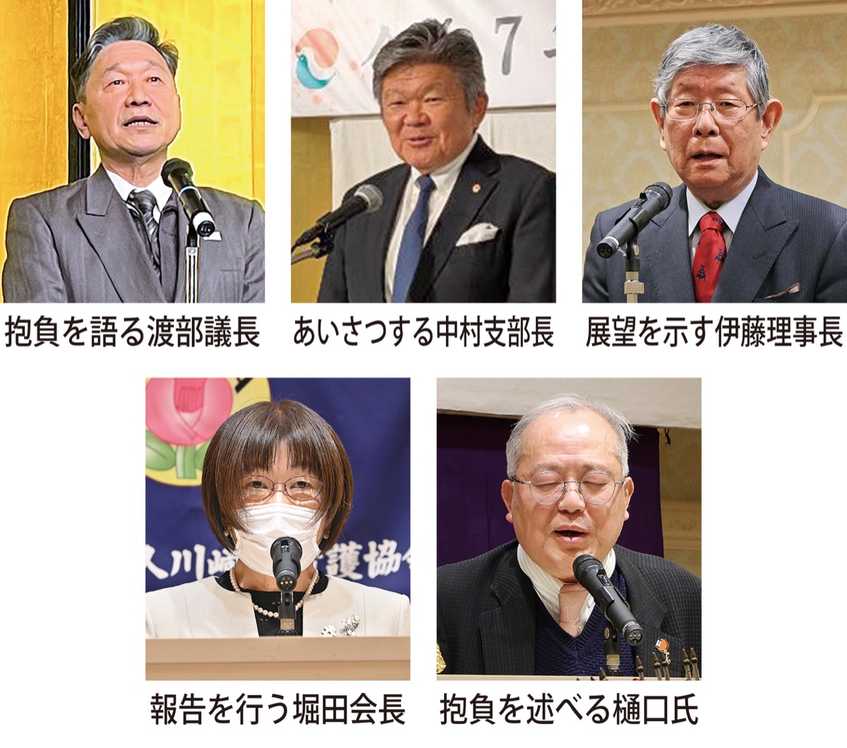 区内を拠点に活動する川崎北ライオンズクラブ(有田茂会長)、川崎中原ライオンズクラブ(鳥海信明会長)、川崎巽ライオンズクラブ(今井宏志会長)、川崎リバティライオンズクラブ(古宮雅之会長)の4団体が合同で開催し、関係者ら45人が出席。4クラブを取りまとめるゾーンチェアパーソンの樋口一夫氏(川崎北LC)は、脳梗塞から復帰してこの場に立ったことを話し、「クラブが仲良く協力し合って、献血や青少年の支援などを継続して取り組んでいく」と話した。来賓として、第2副地区ガバナー立候補予定者の井田渉氏(川崎富士見LC)も出席。「会員のみなさんと共に、楽しく奉仕活動に取り組み、クラブを一緒に盛り上げていきたい」と決意表明した。4クラブの会長も檀上に立ち、「クラブ会員が減少する中、各団体が協力しながら活動し、会員募集にも力を入れたい」と力を込めた。(1月27日、ホテル精養軒)