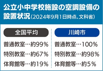 猛暑による熱中症対策や防災拠点となる避難所の安全を確保しようと、川崎市議会は先月、公立学校の体育館などへの空調設備の整備促進を求める決議案を全会一致で可決した。国も整備に向けた財政支援の拡充を表明。市内の学校体育館への設置率は約5%にとどまっており、状況改善に期待がかかる。