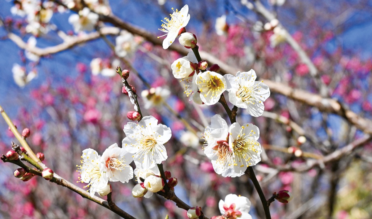 立春を迎え、春もすぐそこに--。井田伊勢台公園の上側にある同緑地保全地区では紅白の梅が咲き始め、まもなく見頃を迎える=写真(1月30日撮影)。