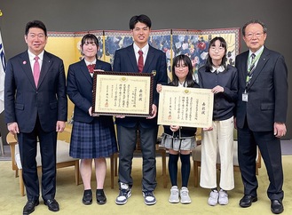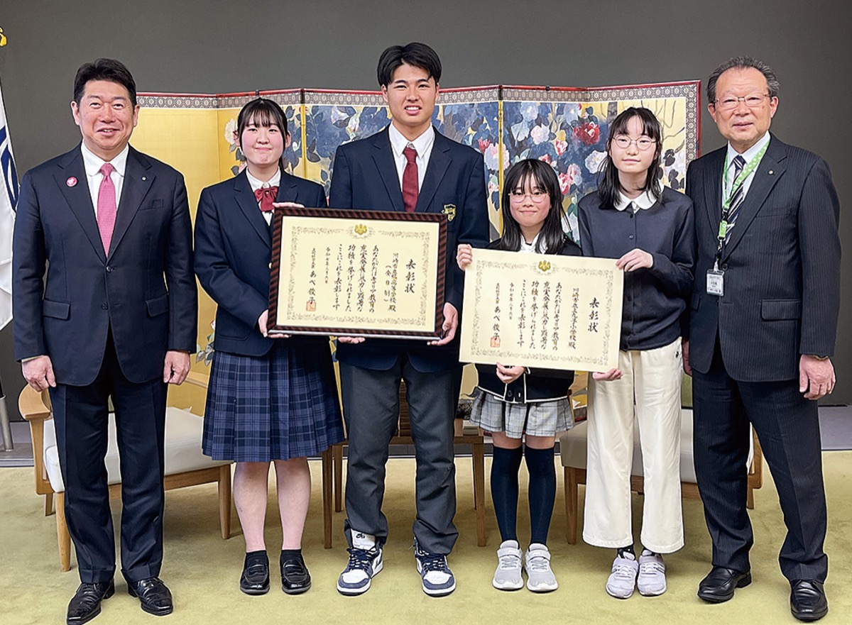 上丸子小学校(上丸子八幡町)と市立橘高等学校(中丸子)の生徒4人らが2月13日、福田紀彦市長を表敬訪問し、「第17回キャリア教育優良学校 文部科学大臣表彰」の受賞報告を行った。