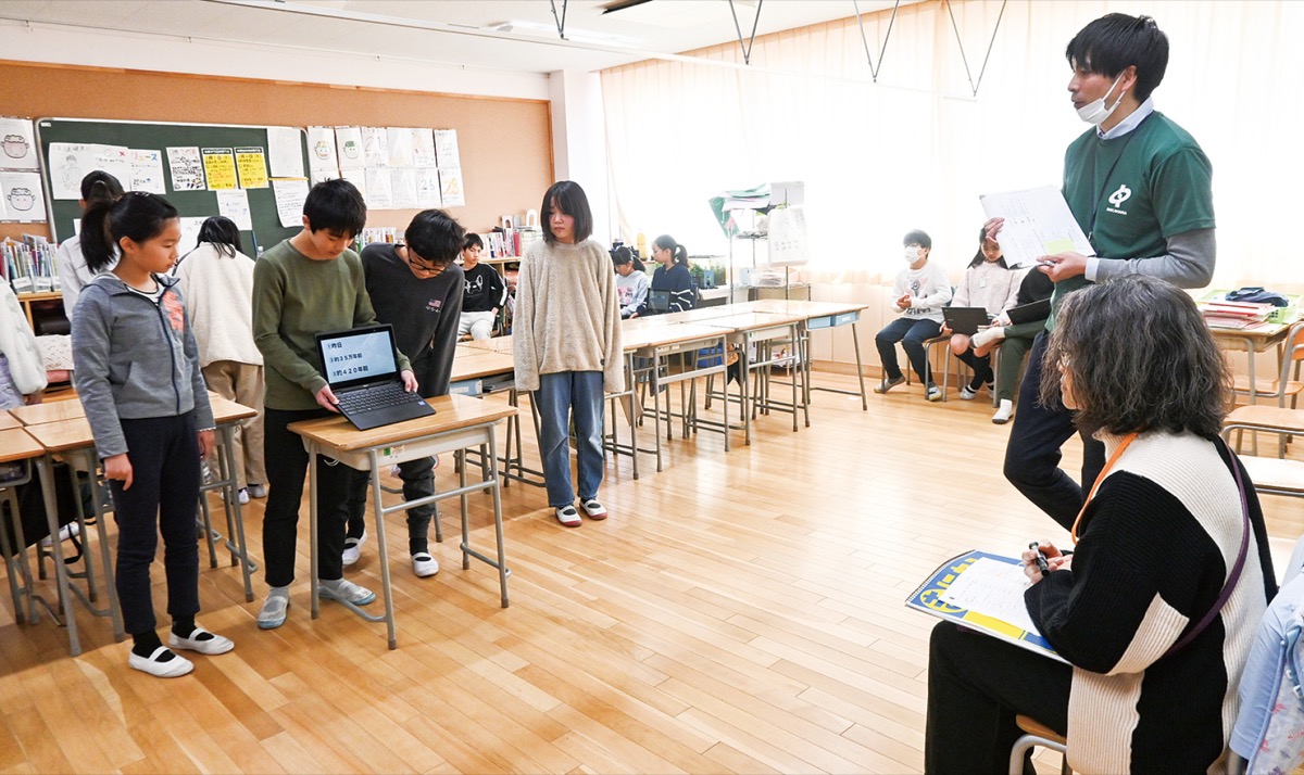 児童たちは、4年生のころから学校の近くを流れる二ヶ領用水について学習。「川崎の宝」と位置づけ「歴史」「環境」「生き物」について研究、探求してきたことをグループに分かれて、参加した大人たち一人ひとりに発表した。
