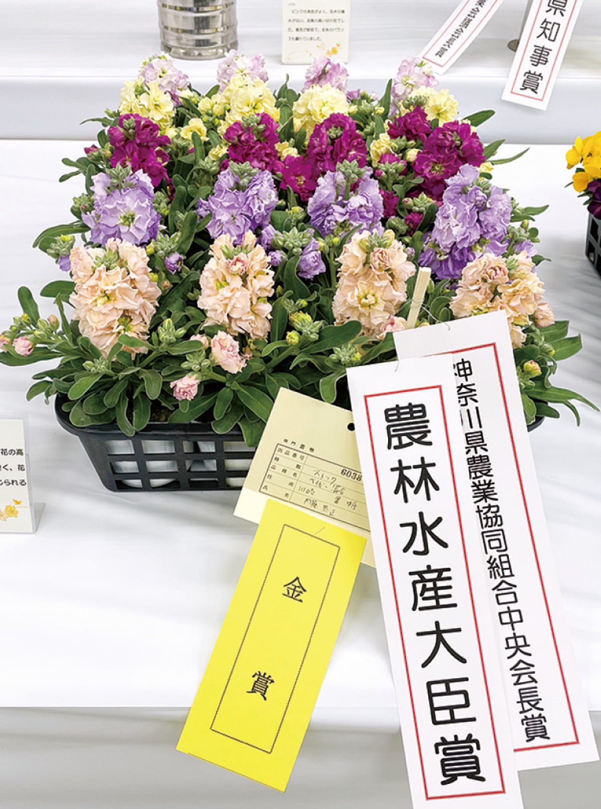 内藤さんは、昨年開催された「第46回神奈川県花き展覧会」にストックを出品。最高位となる同賞を受賞した。これでにも数々の品評会、展覧会で入賞歴があり、2002年にも川崎市花卉立毛共進会パンジー・ビオラの部で農林水産大臣賞を受賞し、今回で2度目。