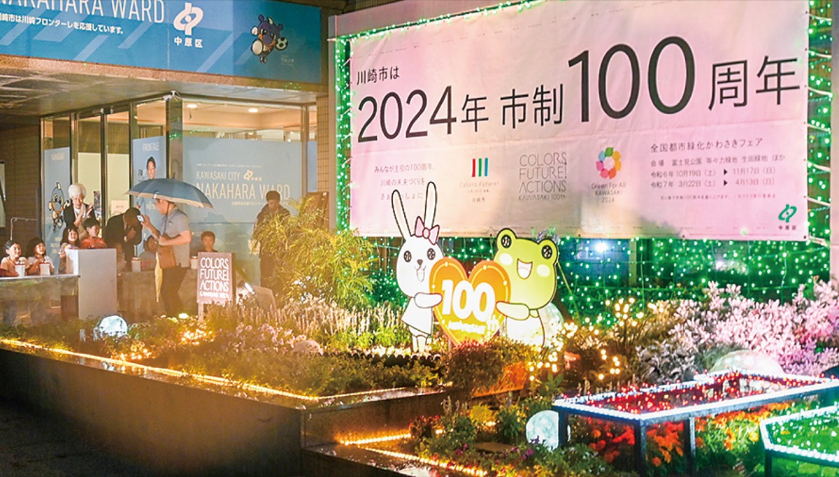 中原区役所正面前の市制100周年記念花壇のライトアップが3月30日(日)まで行われている。午後5時30分から8時30分。花で作った100の文字を縁取ったライトや、子育て支援マスコット「ミミ・ケロ」のオブジェが花壇を鮮やかに彩る。天候による中止情報は区のウェブサイトで。