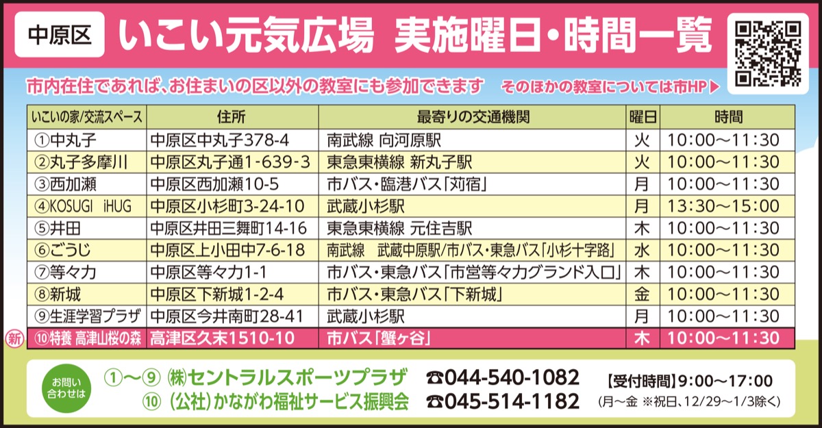 対象は、市内在住で川崎市住民基本台帳に登録されている65歳以上で、【1】医師から運動を禁止されていない【2】要介護1〜5の認定を受けていない人。持ち物はタオルと飲み物等。申込みは各教室のお問合せ先へ。4月から高津区等で新規教室もオープン。申込み開始は4月1日から。