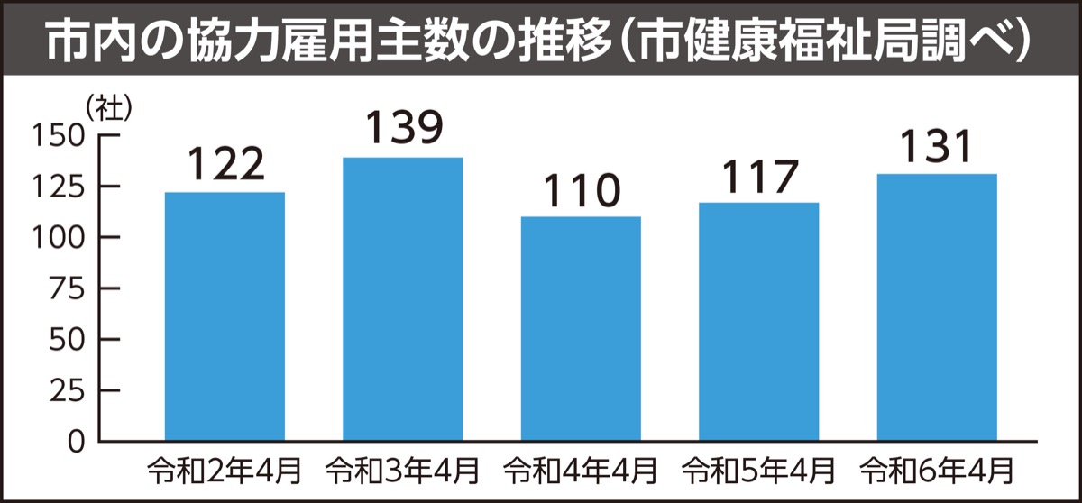 ところが、現在の日本の犯罪は減少傾向でありますが、刑務所や少年院を出所した後、再び犯罪や非行を行ってしまう人も少なくありません。警察庁の犯罪統計によれば、再犯率は約48%と先進国においてトップクラスです。なぜ再び犯罪や非行に走ってしまうのか。その要因の一つとして、就労と住居の確保が背景にあるようです。法務省の資料によると、再び刑務所に入所した者のうち、約7割が再犯時には仕事がなく無職でありました。就労は安定した生活を送るうえで、重要な基盤であります。しかし、刑務所出所後の就労確保は円滑に進まないと言われております。本市では、別表の通り、令和6年4月時点で出所者の自立、社会復帰雇用に協力いただける「協力雇用主」として131社に登録いただいておりますが、実際に雇用している協力雇用主はかなり少ないのが現状であります。