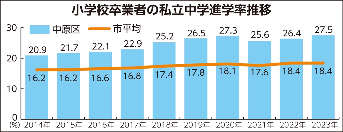 中原区の私立中学校進学率は市内では依然として高く、前年度の26・4%からは1・1ポイントの上昇。21年度は14年度から7年ぶりに下降したものの、以後は2年連続の上昇となった。27・5%は、資料にある1989年以降では最高値となる。全市的には前年の18・4%から変わらず横ばいになっており、川崎区、宮前区、麻生区で前年より上昇した。