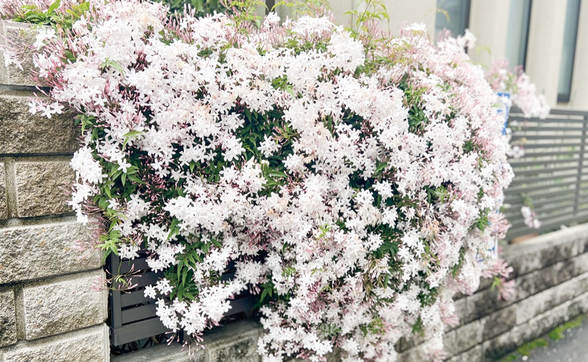 白くかれんな花が、満開を迎えている。上新城の柏原美佐子さん宅の生垣を覆うように、力いっぱい咲くのは「ハゴロモジャスミン」。中国原産のつる植物で、ピンク色のつぼみから、白い小さな花を咲かせる。甘く濃い香りが特徴だ。