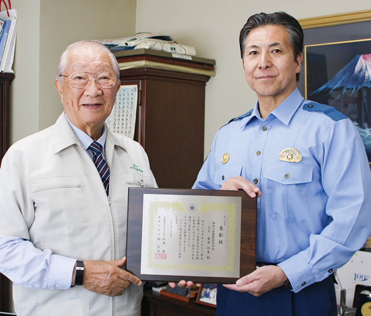6月4日にホテルグランドアーク半蔵門(東京都千代田区)で行われた式典には、仕事の都合で出席できなかった簑原さん。6月18日に、菅健司中原警察署長が松澤建全国警察官友の会会長と楠芳伸警察庁長官の代理として表彰状と記念の協力徽章を上小田中にある勤務先に届け、代読した上で手渡した。