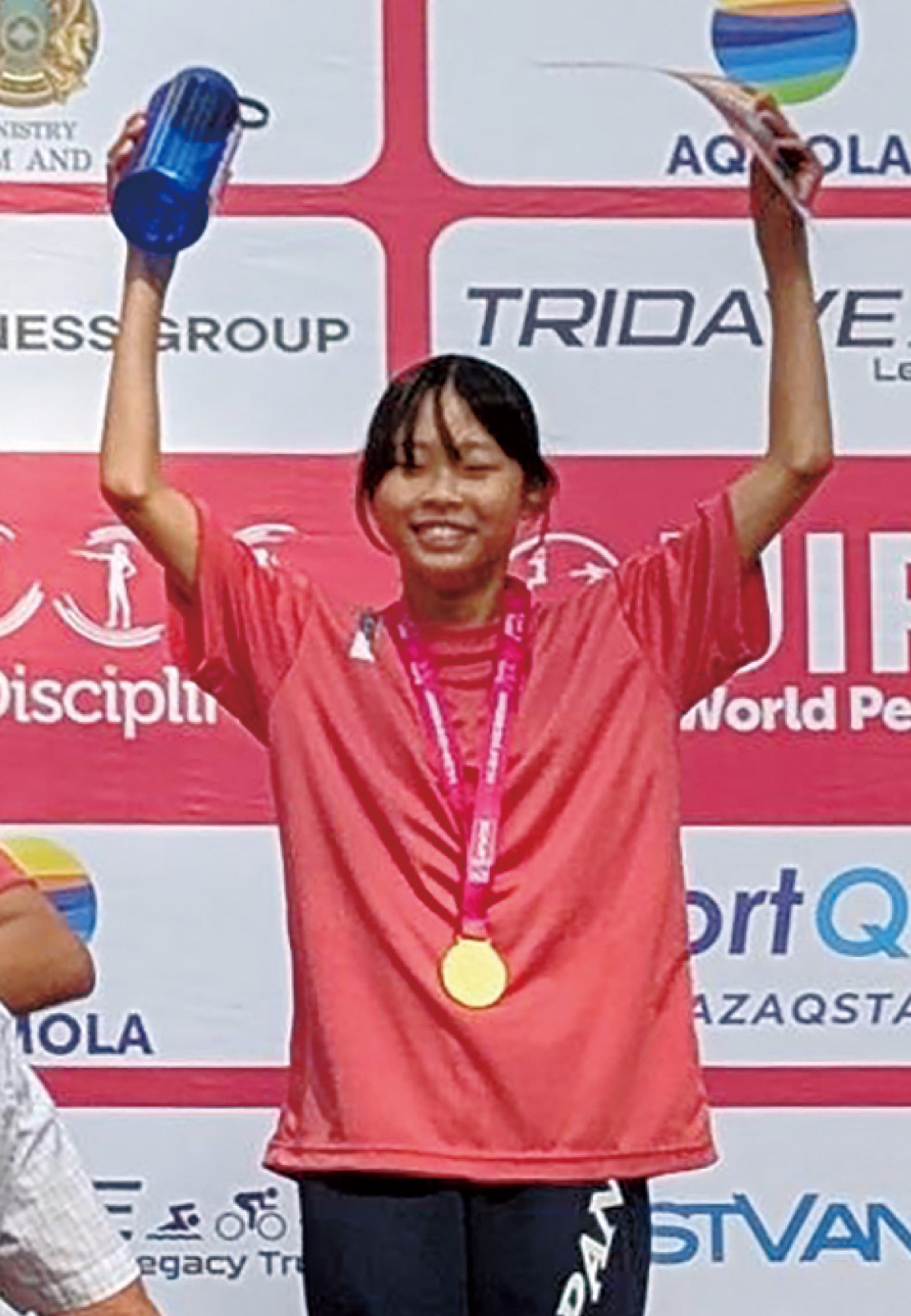 水泳、レーザーラン射撃、ランニングの3つの種目でスピードを競う近代三種競技。大谷戸小学校6年の志村侑香さんが、7月3日から6日にカザフスタンで行われた近代三種アジア選手権大会(13歳以下)で金2つを含む4つのメダルを獲得した。これで、12月に南アフリカで開催される世界選手権の日本代表に内定した。