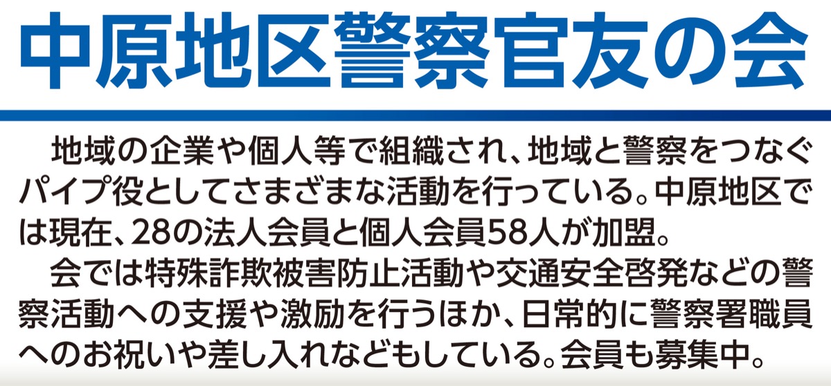 受賞に対し、簑原さんは「日頃から我々市民の安全を守ってくれている警察署員の皆さんに感謝したい。これからも微力ながら会としてお手伝いさせていただくことで、署員の皆さんには『自分たちの応援団が見守ってくれている』ことを感じてもらえたらうれしい」と思いを込めた。簑原さんは、中原警察署へ頻繁に顔を出し、署員らに「ご苦労さま」とねぎらいの言葉を掛けている。