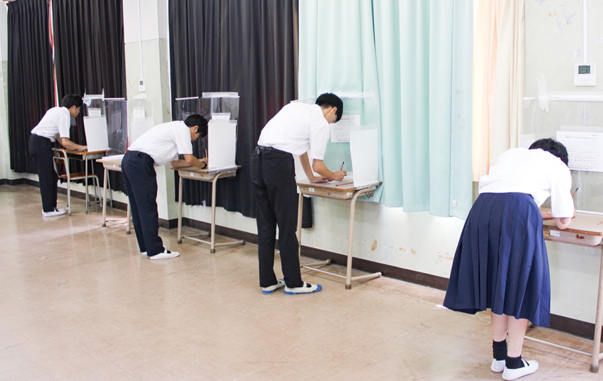県立住吉高校(木月住吉町)で7月18日、参議院選挙に合わせた3年に1度の模擬投票の特別授業が行われ、同校に分教室がある県立中原支援学校の高校生35人も投票に臨んだ。生徒たちは誰に託すのかを自分で考えて投票用紙に記入し、実際の投票所と同じようにしつらえた教室で投票箱に思いを込めた1票を投じた。