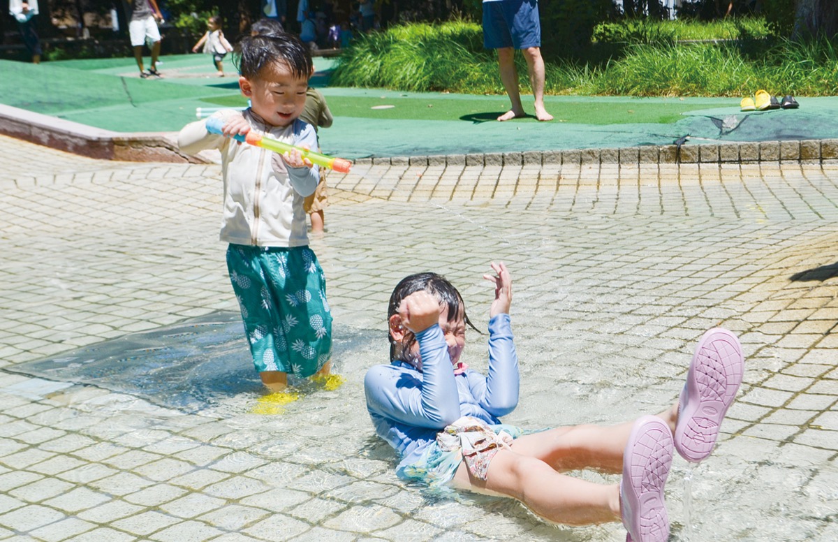 最高気温が35度となった7月26日、憩いの広場として知られる中原平和公園(木月住吉町)にある「はだしの広場」では、水着姿で水遊びを楽しむ子どもたちや保護者らでにぎわいを見せていた。水鉄砲やバケツを持参し、互いに水をかけあったり、その場でおもちゃを貸しあいながら子どもたち同士で一緒に遊んだりするほのぼのとした光景が見られた。
