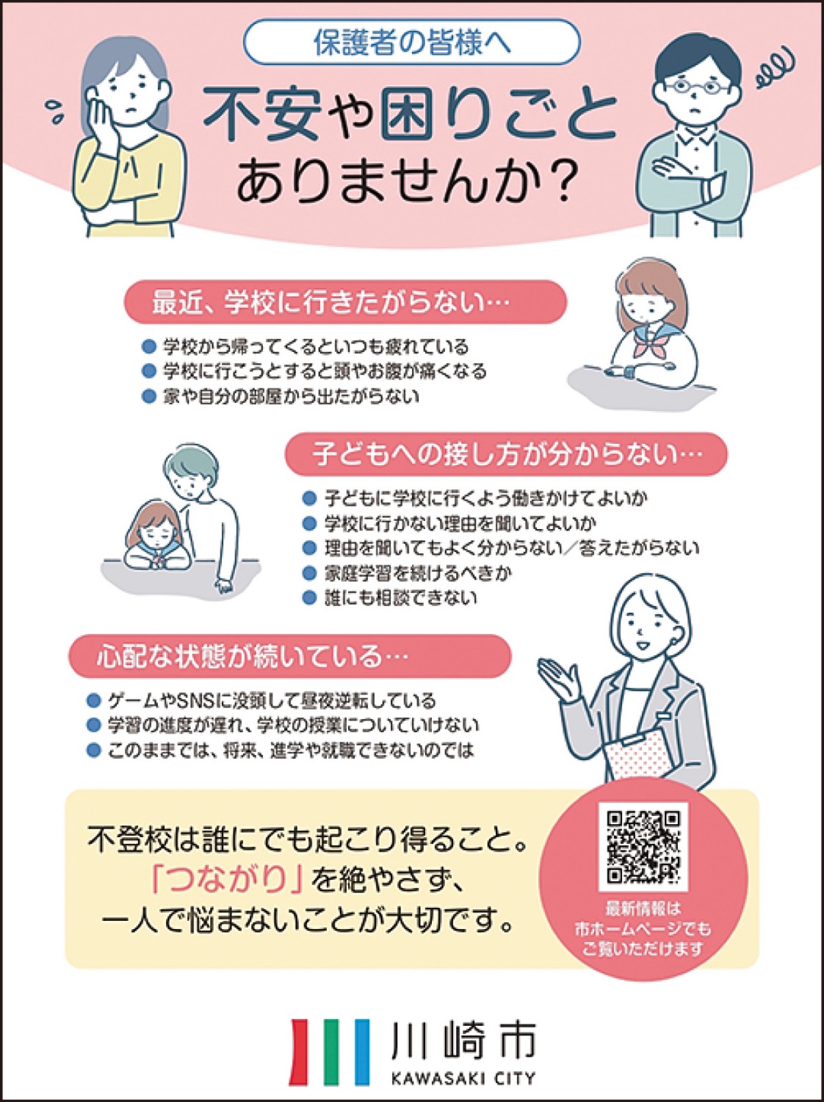 また、子どもや保護者が悩みを抱えて孤立しないように、新たにLINE公式アカウント「川崎市支援教育課_多様な学び支援」が開設され、不登校相談会や体験活動等の情報が発信されています。このアカウントは情報発信専用ですが、メニューで相談窓口も紹介されています。
