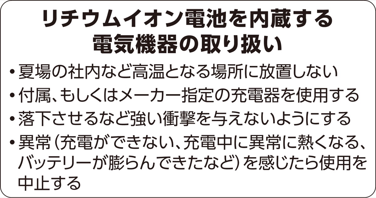 電気機器や配線器具などによる電気火災のうち、昨今の猛暑でスマートフォンやモバイルバッテリー、充電式扇風機などのリチウムイオン電池に起因する火災が増えており、市内でも昨年1年で30件、今年上半期では13件だった。市消防局ではリチウムイオン電池を内蔵する機器に関し、「正しく取り扱い、スマホなどに異常を感じたらすぐに使用を中止し、金属の容器に入れたうえで購入店やメーカーに相談を」と訴えている。