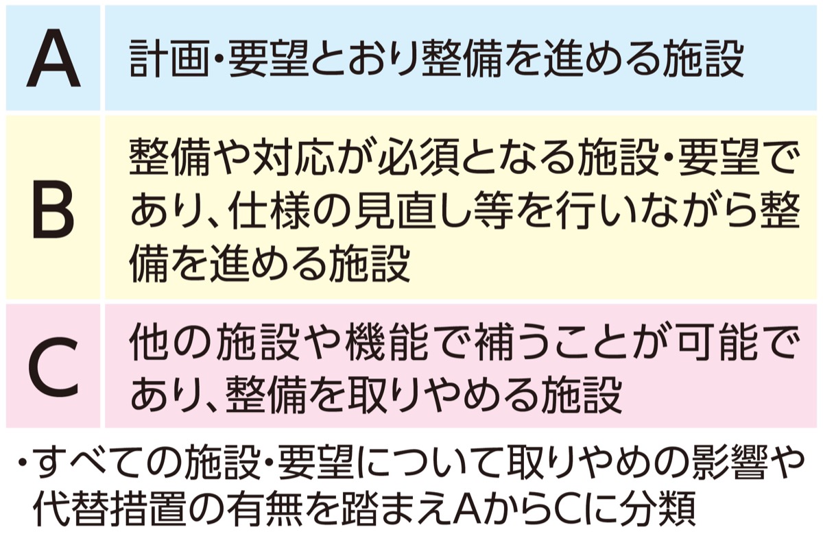 その中でも主たる問題は2倍近くに膨れ上がった総事業費であります。以上の状況に対し、市は全施設の整備を見直し、別表の通りA・B・Cの分類を行いました。