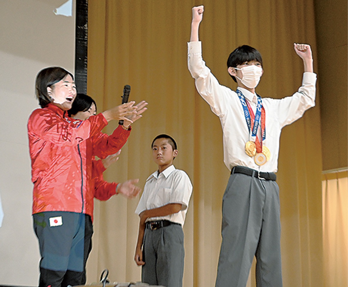 講演を聞いた生徒会役員の桒原航助さん(3年)は「自分の楽しいことを見つけて目標にしていきたい」と感想を話した。鈴木PTA会長は「オリンピック選手の話を聞く機会は少ない。説得力が違う。子どもたちに火が付いたような感覚がある。企画して良かった」と振り返った。