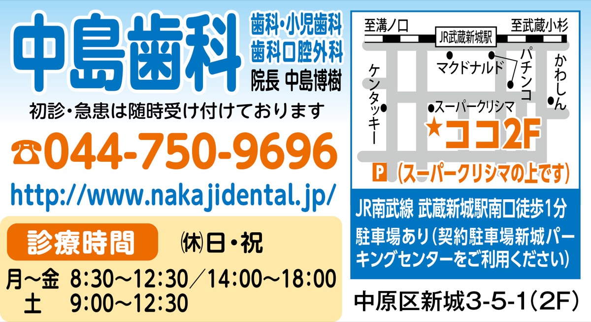 「親子で通える歯医者さん」を掲げ、子どもからシニアまで幅広い年齢の患者さんが通う武蔵新城の『中島歯科』。定期検診の重要性を強く呼び掛けている。