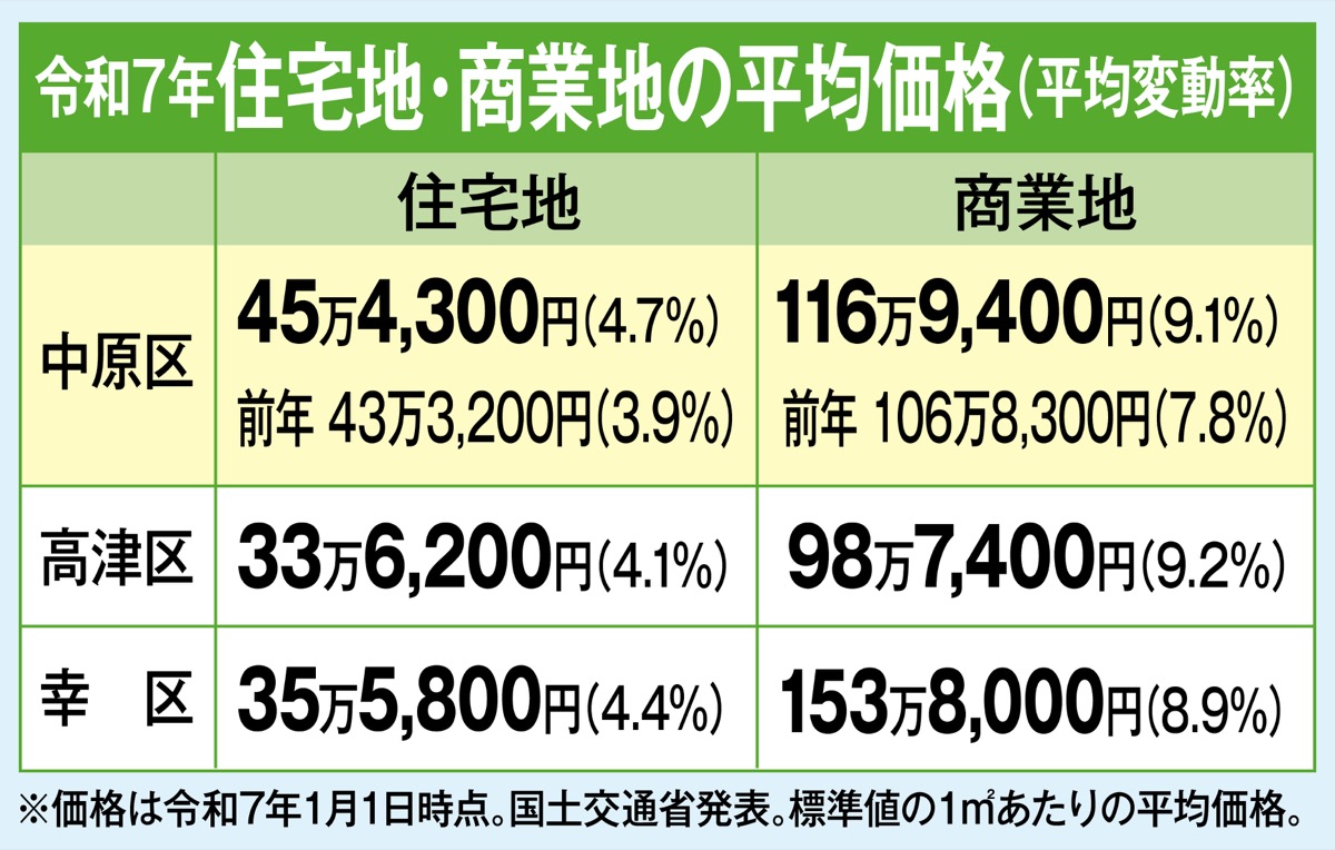 国交省が今年3月に公表した令和7年の公示地価で、川崎市は全ての区で上昇し、平均変動率は4・4%と上昇率が拡大した。中原区は4・7%で、13年連続の上昇となった。交通利便性の高い住宅地を中心に需要が堅調で地価が上がり、起伏のある地勢やバス圏でも上昇がみられた。商業地の変動率も9・1%で大幅に上昇した。