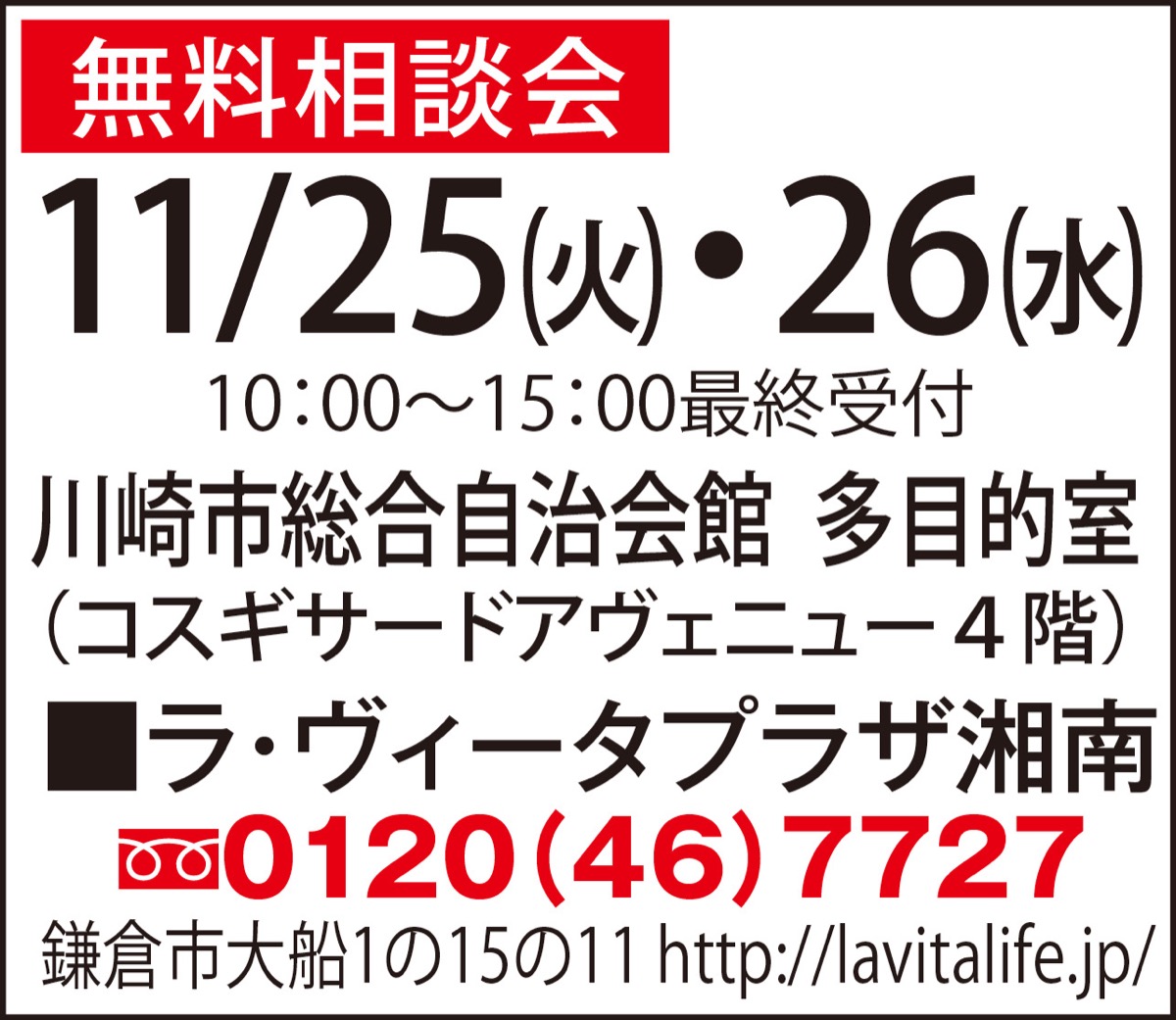 有料老人ホームや高齢者住宅など各種施設を、第三者の立場で紹介する「ラ・ヴィータプラザ湘南」による無料相談会が11月25日(火)・26日(水)の10時〜15時最終受付に、川崎市総合自治会館多目的室(コスギサードアヴェニュー4階/JR南武線武蔵小杉駅・東急武蔵小杉駅から徒歩2分)で開催される。予約不要。相談は1組1時間程度。