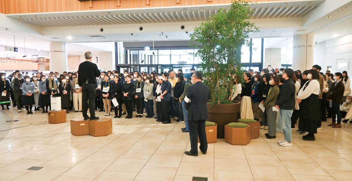 訓練後に行われた総評で、訓練に参加した400人を前に平賀支配人は「今までにない形での訓練になった。実際に火災が起きた際にどうするか。シャッターが下りるとどこに逃げていいかわからなくなる。頼りは従業員。どれだけ非常口を知っているか。多くの逃げ道の選択を持ってほしい」と従業員に呼び掛けた。消防署の担当者は「初動が素晴らしかった。皆さん真剣に取り組んでいた。今日は訓練だとわかっていたが、実際は突然に起きるもの。防災センターからの放送が肝になる。それを聞き逃さないようにしてほしい」と話した。