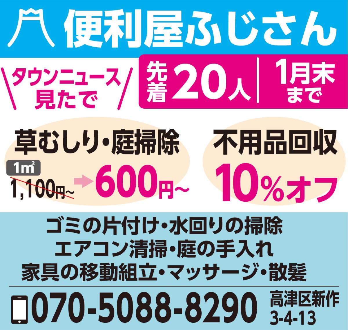 何かと慌ただしい師走を迎え、やることの多さに途方に暮れている人に朗報!暮らしの中で「困った」ことがあればぜひ「便利屋ふじさん」へ。ゴミの片付けから不用品回収、さらに水回りなどを含めた清掃全般、庭の手入れ、草むしり、家具の組立て、家具の移動、マッサージや出張散髪などに至るまで、要望にあわせ文字通り「なんでもお任せ!」の同所。
