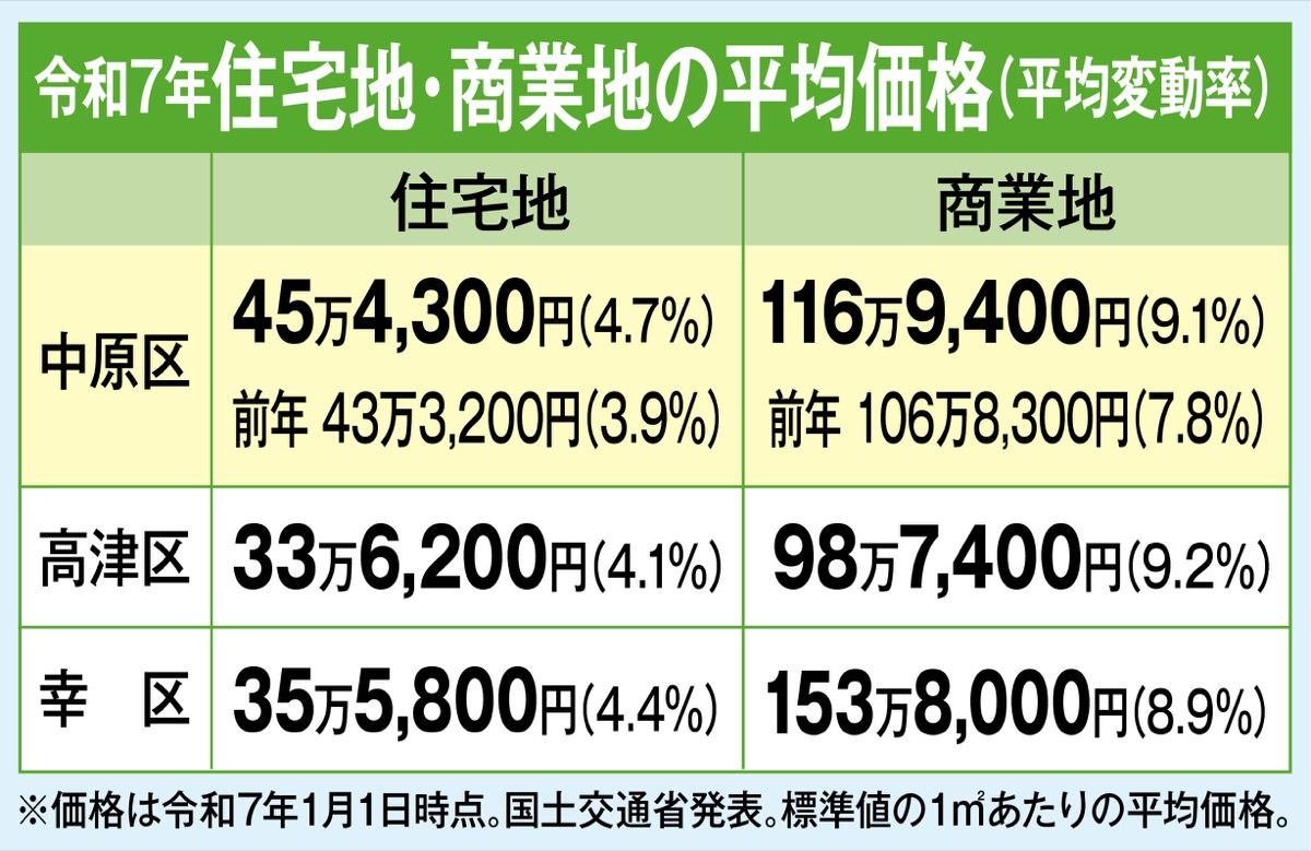 国交省が昨年3月に公表した令和7年の公示地価で、川崎市は全ての区で上昇し、平均変動率は4・4%と上昇率が拡大した。中原区は4・7%で、13年連続の上昇となった。交通利便性の高い住宅地を中心に需要が堅調で地価が上がり、起伏のある地勢やバス圏でも上昇がみられた。商業地の変動率も9・1%で大幅に上昇した。