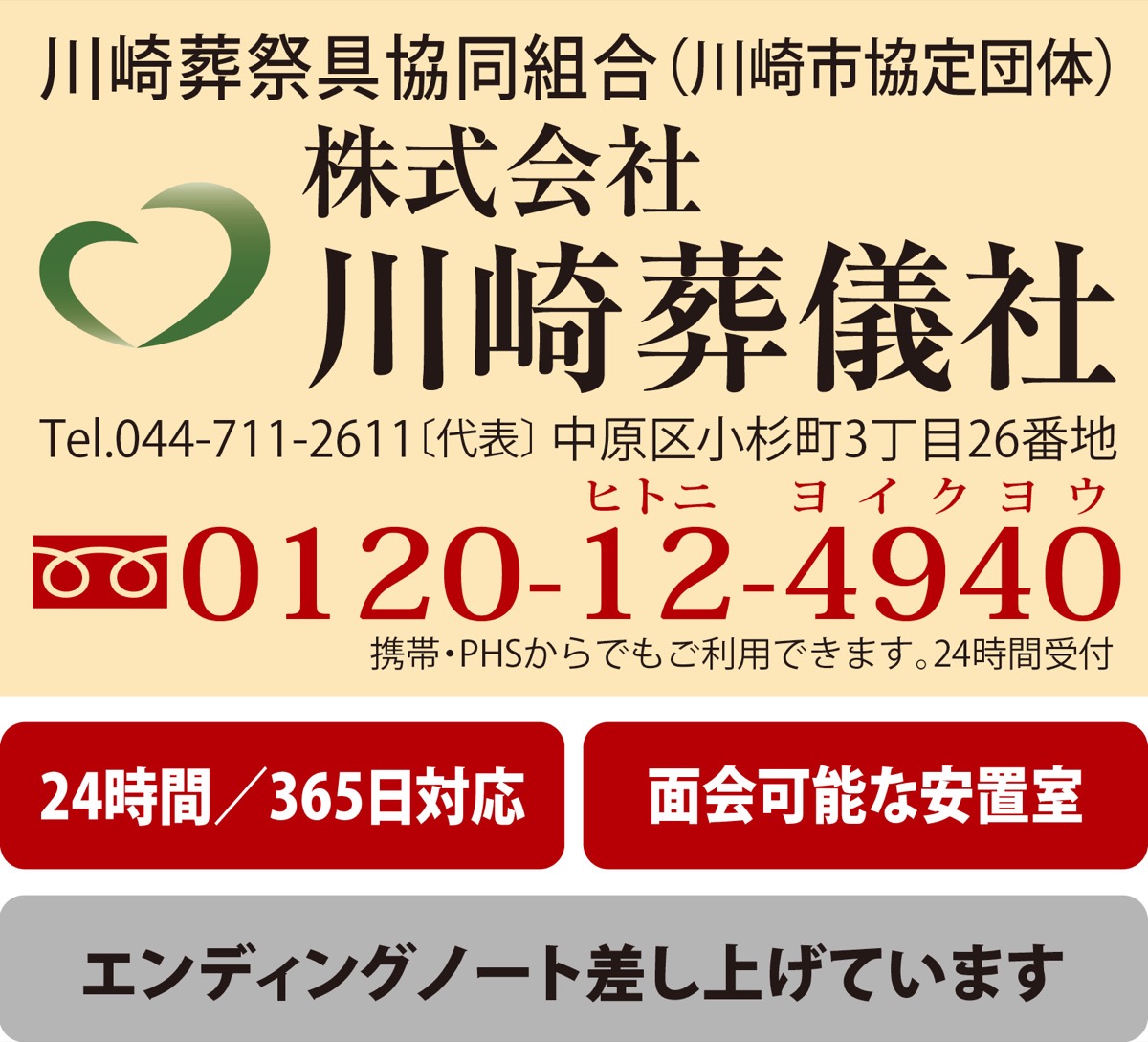 1951年創業、中原区役所前で安心・信頼・真心のサービスを届ける(株)川崎葬儀社。齋藤社長は、川崎市と連携し、市民葬儀の環境改善等に取り組む「川崎葬祭具協同組合」の理事長も務める。昨年10月には、川崎市と災害時の支援協定を再締結し、業界としての地域貢献活動にも積極的に取り組んでいる。
