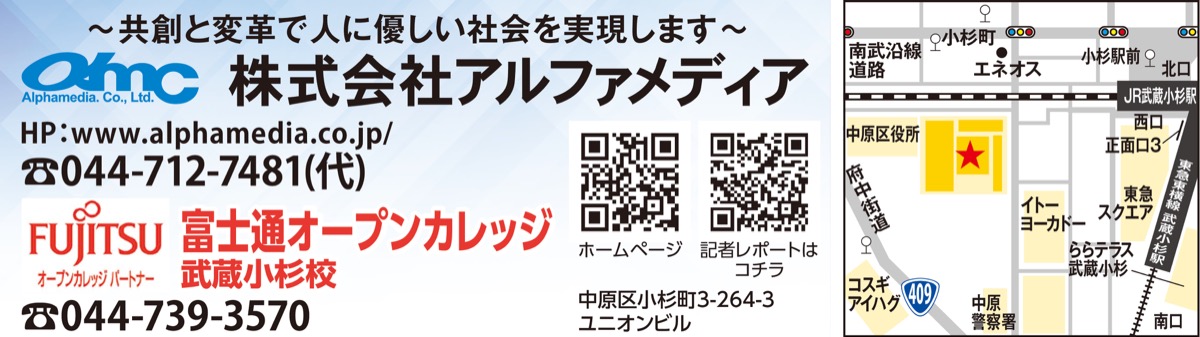 ソフトウェアやウェブシステムの開発のほか、パソコン教室「富士通オープンカレッジ武蔵小杉校」の運営やパソコンサポート業務など、IT関連の事業を通じ、社会貢献を目指している「(株)アルファメディア」。