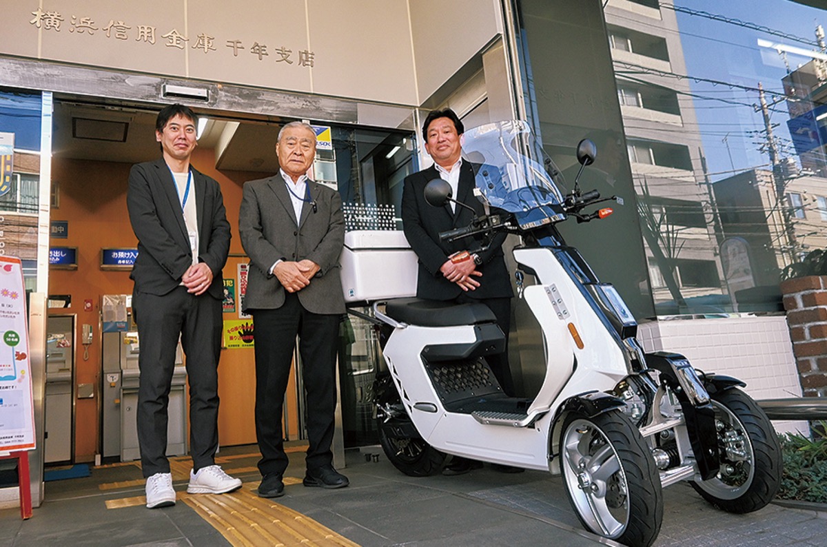 横浜信用金庫千年支店(加藤良武支店長)は1月13日、中原区内に本社を構える自動車メーカー・(株)日本エレクトライク(松波登代表取締役)の電気三輪バイク「スイング・スポーツ」を導入した。