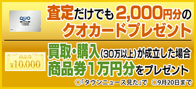 現在、同店では秋の決算セールを実施中。期間中に査定をした人全員に2000円分のクオカードがプレゼントされるほか、購入または売買成立(30万円以上)で商品券1万円分の嬉しいプレゼントも。来店はもちろん、出張見積もりも無料なので売却を考えている人は20日までにガリバーへ。