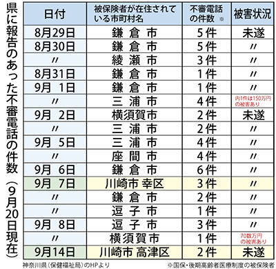 高齢者を狙った医療費還付金詐欺が県内各地で発生している。8月29日から今月14日にかけて県内での発生報告は48件、市内でも幸、高津であわせて5件発生しており、市では不審電話などに注意を呼びかけている。