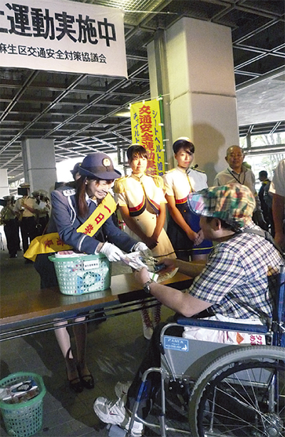 通行人の多い新百合ヶ丘駅付近で交通事故防止を訴えるキャンペーンを行った高見さんは、警察服に身を包み、チラシ配布などを行った。