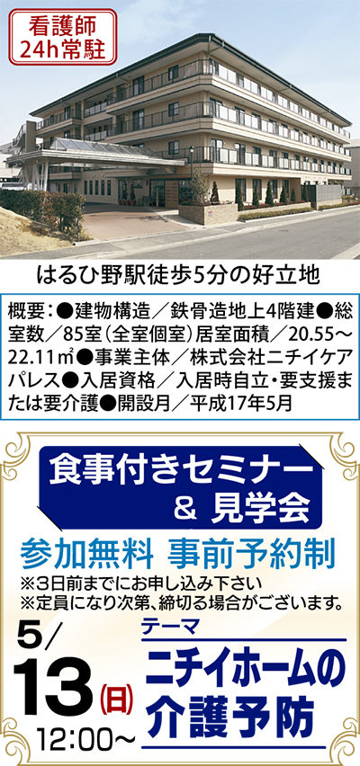 医療と介護と共に歩み、40年以上の実績をもつニチイグループの有料老人ホーム「ニチイホーム はるひ野II番館」が、5月13日に食事付きセミナー&見学会を実施する。