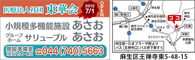 高齢者の「家族に負担をかけずに地域で老後を過ごしたい」との声に応え、医療法人東華会が7月1日、地域密着型の小規模多機能施設とグループホームを王禅寺東にオープンする。 ターミナルケアも行っている同施設では、機械浴で重度の人でも定期的な入浴ができるなど、生涯を快適に過ごしてもらうための工夫を行っている。