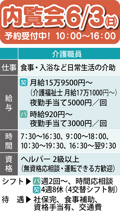 同施設では、共に施設を作り上げる仲間を募集している。小規模の事業所なので、一人ひとりの利用者さんと密なコミュニケーションが取れるのも魅力の一つ。担当者は「地域密着の施設だからこそ、地元の方に是非来ていただきたい」と話している。未経験者、夜勤のみの勤務も歓迎しているので、気軽に問い合わせを。