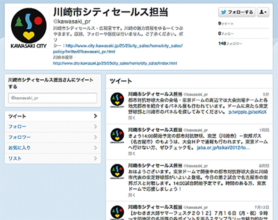 川崎市では、昨年度末からツイッターをはじめとするソーシャルメディア導入の検討を開始。6月に職員向けのガイドラインとツイッターアカウント運用ルールを策定し、今月11日から市民こども局シティセールス・広報室が「kawasaki_pr」というアカウント名で「つぶやき」を始めた。13日にはTVKで現在放送中の市情報番組「LOVEかわさき」の市内での中継日時を投稿。16日午前には、この日午後都内で行われる都市対抗野球に出場する市代表(東芝野球部)の応援を呼びかけるなど、タイムリーな情報を投稿している。16日現在のフォロワーは147人。