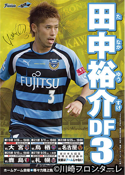 新ポスターはDF田中裕介選手が登場。同選手のサインとともに7月28日(土)の大宮戦から9月29日(土)までの札幌戦の5試合を紹介している。