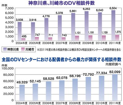 すくらむ21によると、昨年度、川崎市内におけるDV被害の相談件数は、2006年度の711件を大幅に上回る1275件。5年間で約1・8倍に増加した。