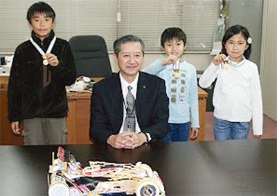 子どもたちが、賞を受賞した発明カー「ライトニングD・T」を区長に披露すると、瀧峠区長は「性能とデザインを両立した見事な車ですね」と労をねぎらった。3人は「このような賞がもらえて嬉しかった。また色々チャレンジしたいです」と嬉しそうに話していた。