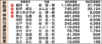 参議院議員選挙の投開票が7月21日に行われた。4議席を11人が争った神奈川選挙区では、自民党の新人・島村大氏(52)が約113万票を獲得し、トップ当選。以下、みんなの党の新人・松沢成文氏(55)、公明党の新人・佐々木さやか氏(32)、民主党の現職・牧山弘恵氏(48)と続き、全国と同様に自民、公明の与党が強さを見せた。