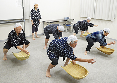 月2回の練習では、着物をきて鼻あてをつけ、手ぬぐいを被り変装。ザルとビクを使い踊る。「軽快なリズム、ひょうきんな踊りが特長です。中腰で腰をふりながら歩くのが基本。滑稽でその場が明るくなり、踊っている私たちも楽しくなるのが魅力です」と森会長は話す。13日に行われたあさお区民まつりでは初めてステージに立った。どじょうすくい踊りは、かくし芸や余興、宴会芸などに用いられることもあり、同会では、ボランティアとして老人ホームや保育園などで披露することもある。